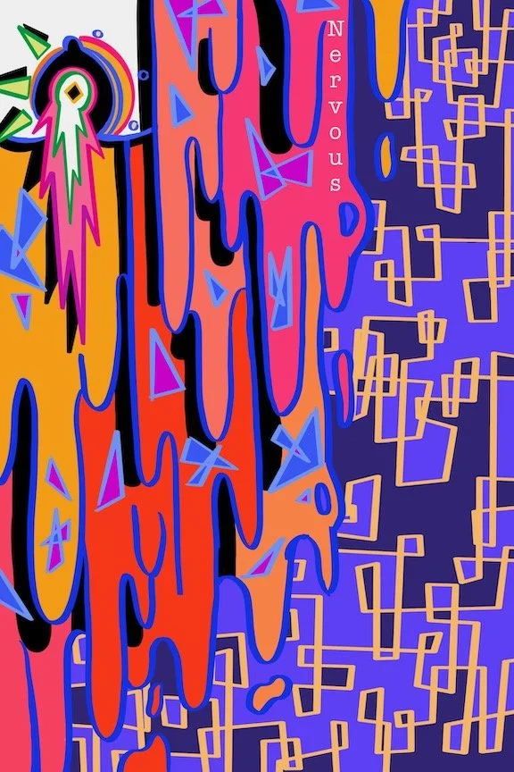 In this surreal illustration, a figure cautiously peeks from the corner of the composition, their gaze laden with trepidation. Hair cascades downward, resembling viscous goo, symbolizing the weight of social anxiety. Intense vibrating colors and clashing sharp and organic shapes are utilized to express the suffocating feeling and further the unease. The artwork delves into fear and explores the fear of connecting with others and being perceived.