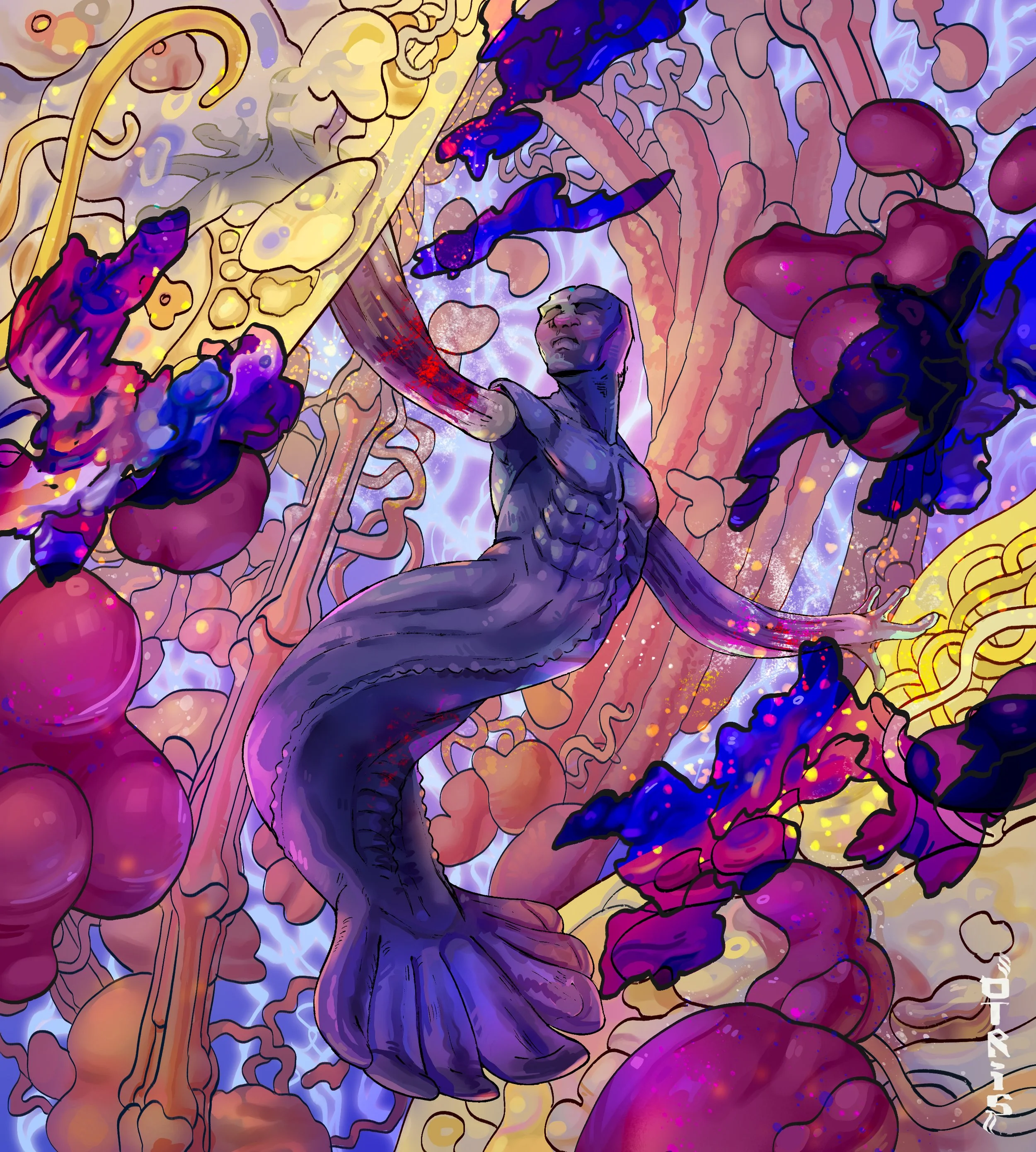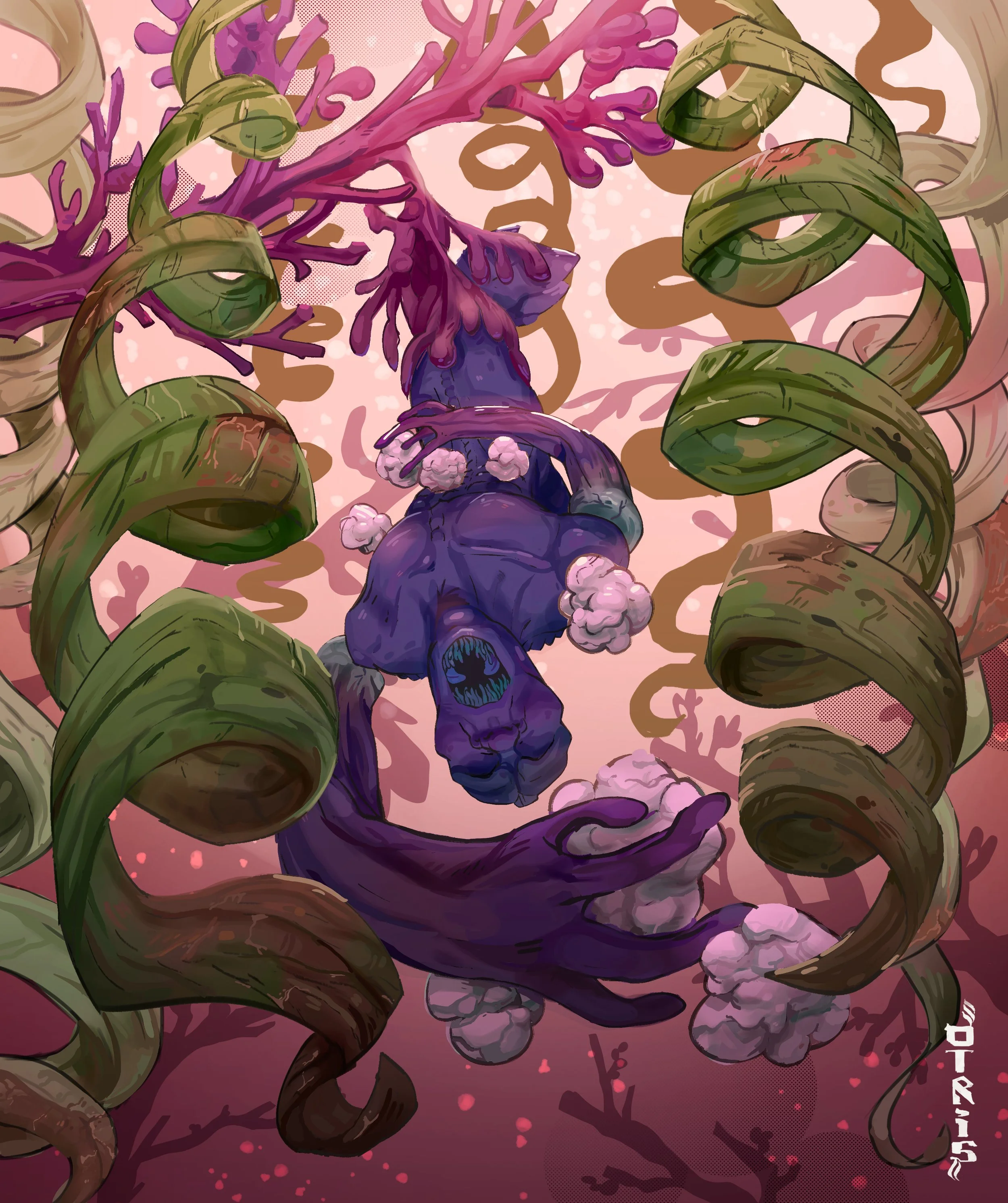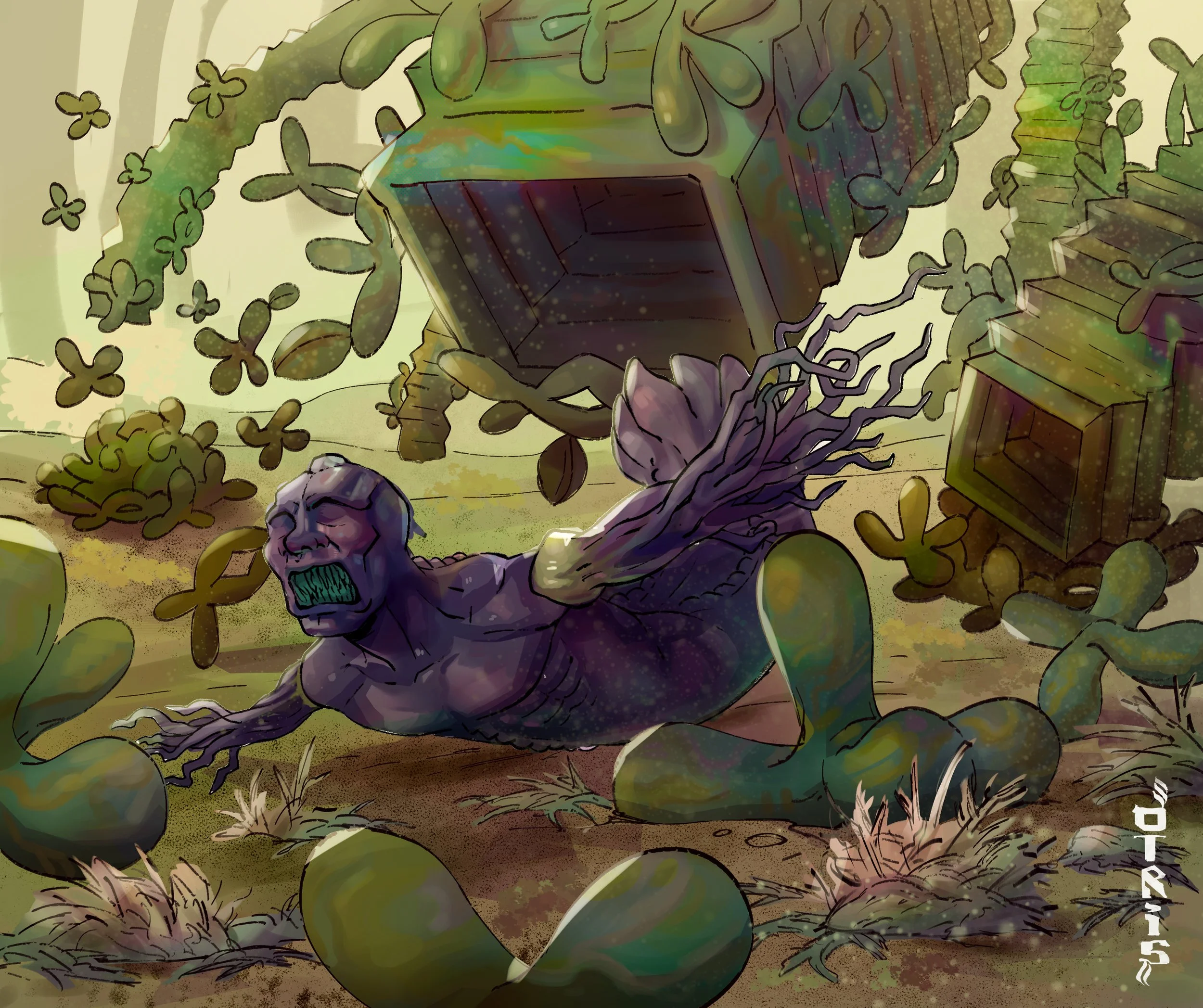 After attempting to harvest some rhodolith’s, Habelkef is ensnared by an algae species as he hangs upside down in the midst of a meat tree in the Biggle Forest.