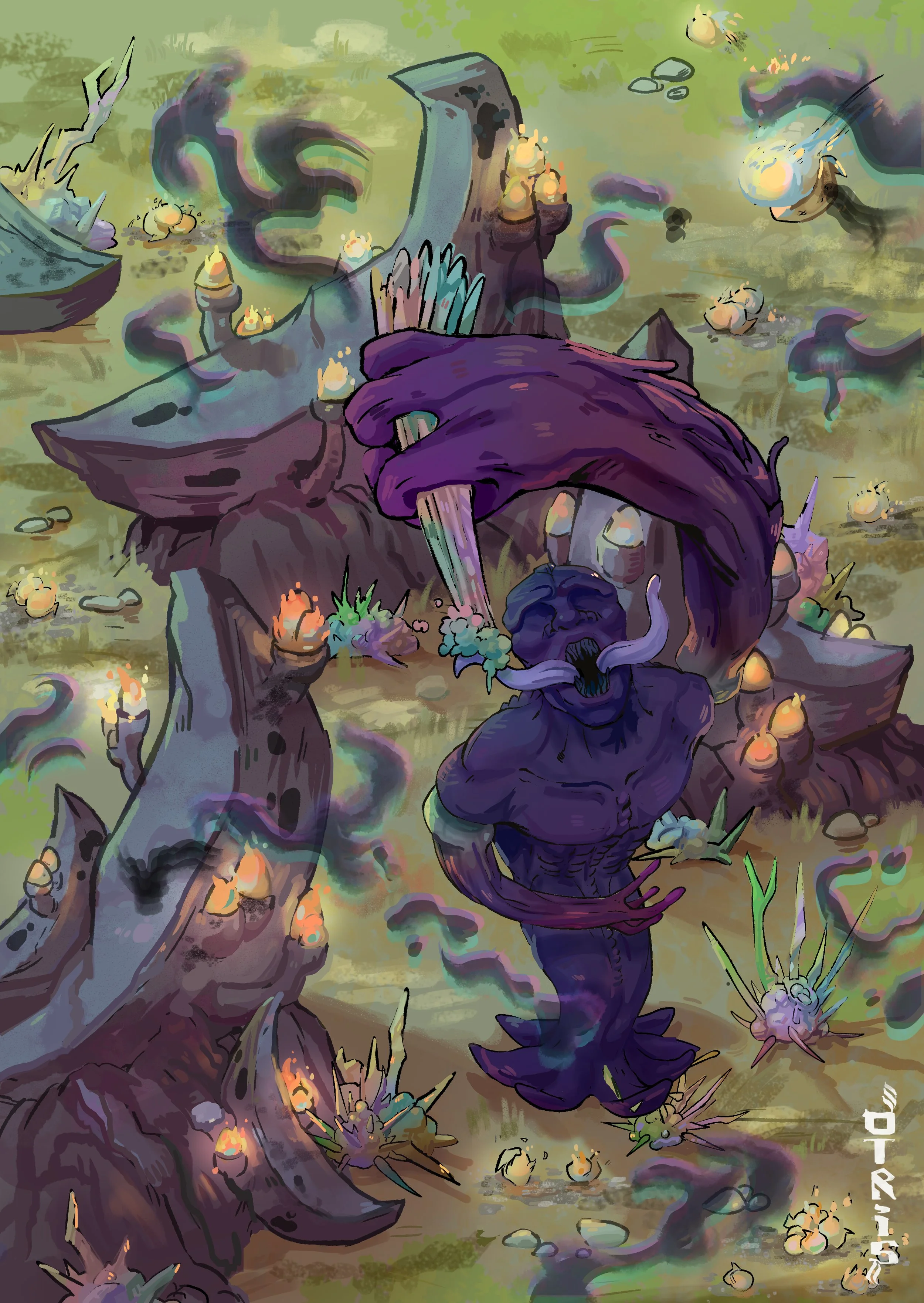 These illustrations depict Habelkef, a rowdy and impulsive Mythtuf, and his encounters with various floral species and the creatures that populate the Otris world.