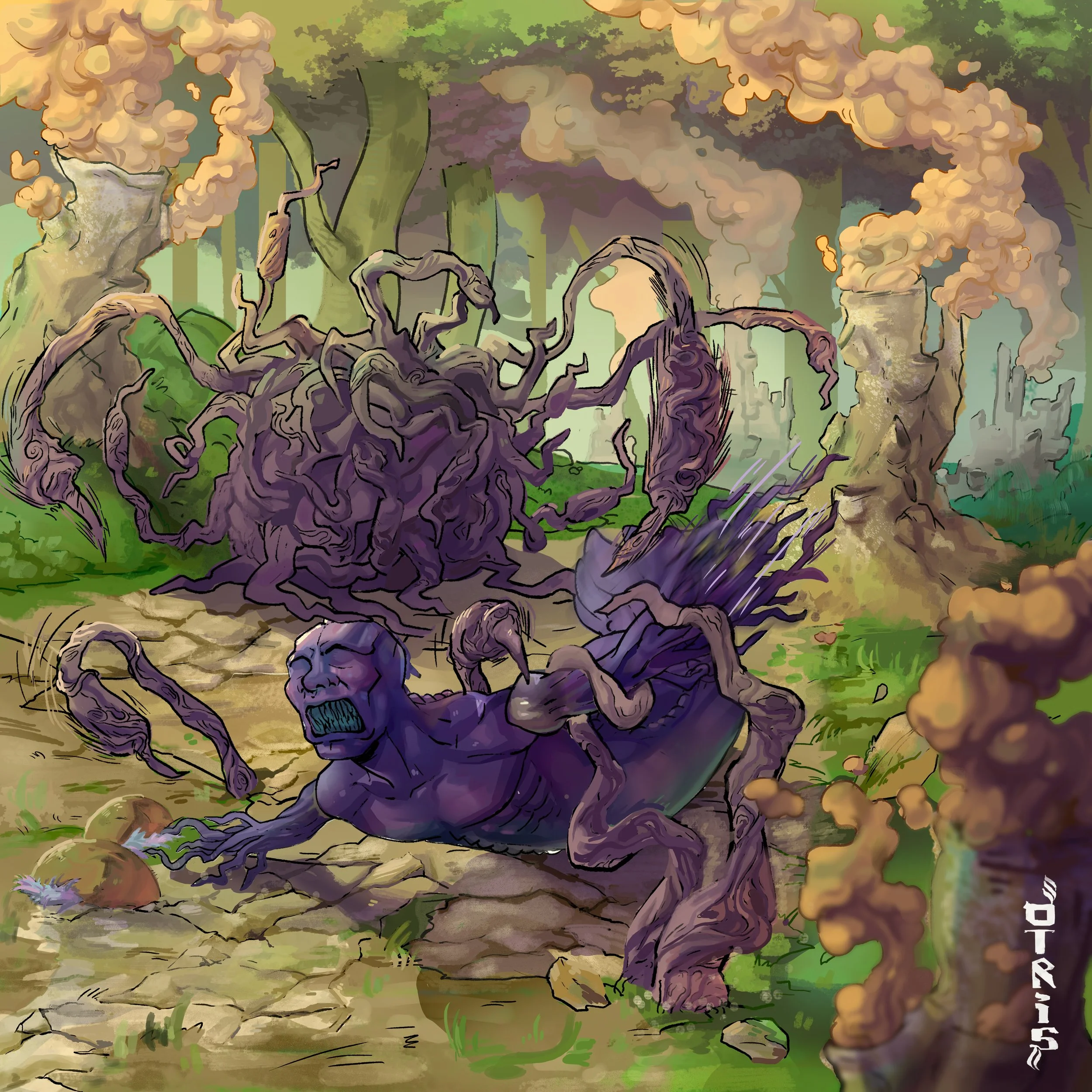 Habelkef runs away from a creature known as a withering bush. It has the ability to dry up environment and the lifeforms it touches. In the background of the Biggle Forest, large plumes of smoke exit the Sulfur Spring orifices.